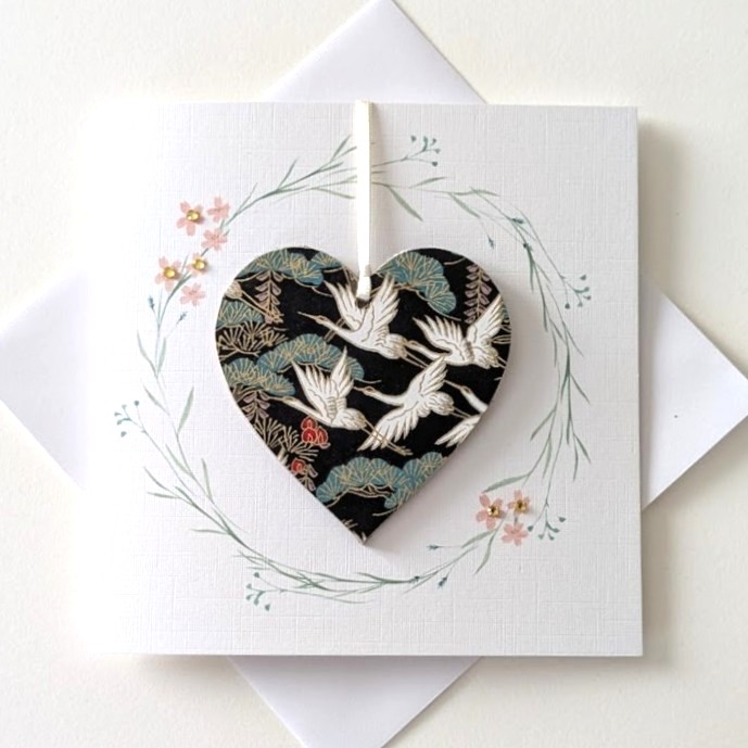 This  card features a detachable, wooden, hanging decoration , decoupaged with Japanese Chiyogami paper. Often appearing in Japanese traditional art and folklore, white herons are seen as messengers of the gods and symbols of good luck making this a thoughtful keepsake for a number of occations including Mother’s Day, Anniversaries and Birthdays . The card is hand finished with crystals and the heart has a satin ribbon for hanging.